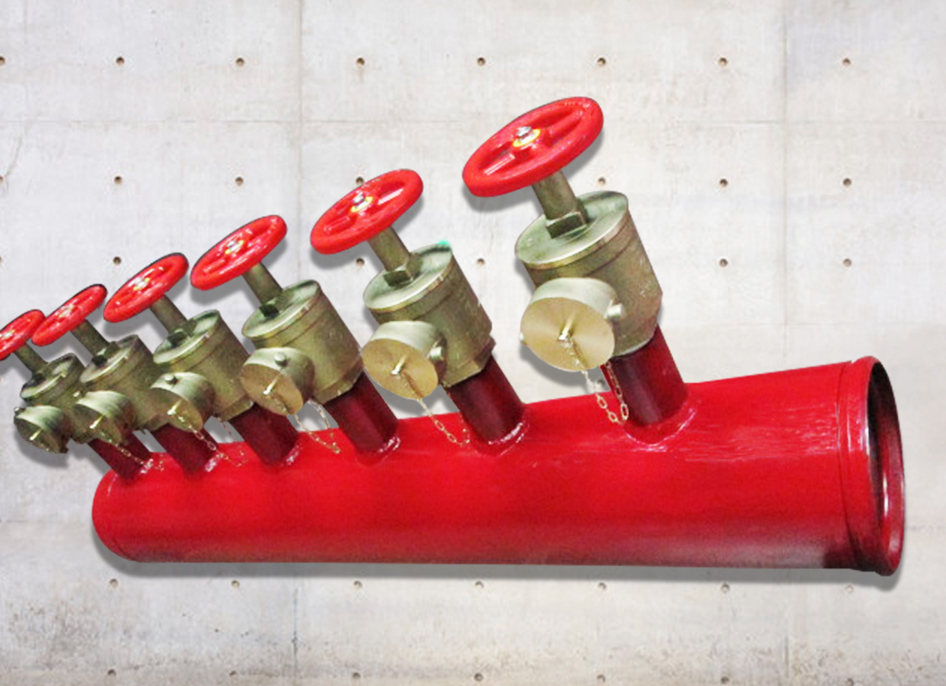 Cabezal tipo flauta fabricado en tubería AC sch 40 sin costura, de 4, 6, 8, 10 y 12”. En sus extremos cap y ranura, además lleva 6 salidas de 2” ½” rosca NPT, terminado en bermellón.